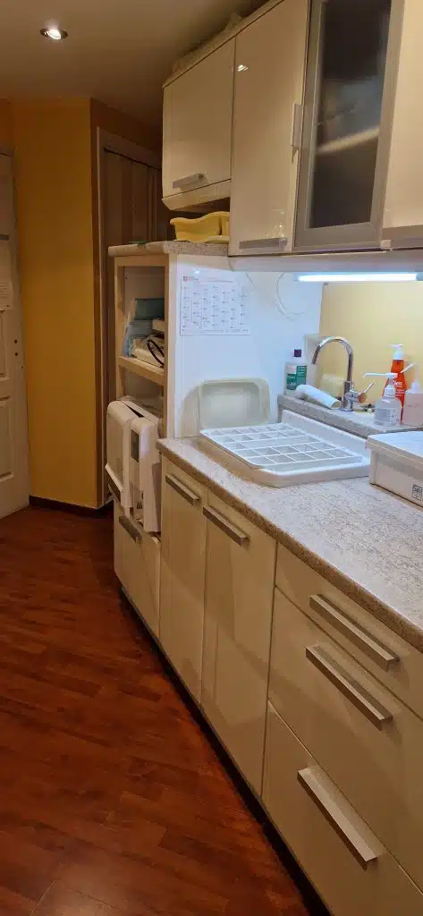 Il se compose de 2 salles de soins, 1 salle de chirurgie, 1 salle de stérilisation, 2 vestiaires, 1 salle d’attente et un comptoir d’accueil.